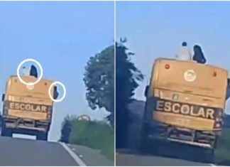 Um ônibus escolar foi flagrado trafegando em uma estrada com alunos sentados no teto e na janela do veículo na cidade de Saboeiro, no interior do Ceará, na última...