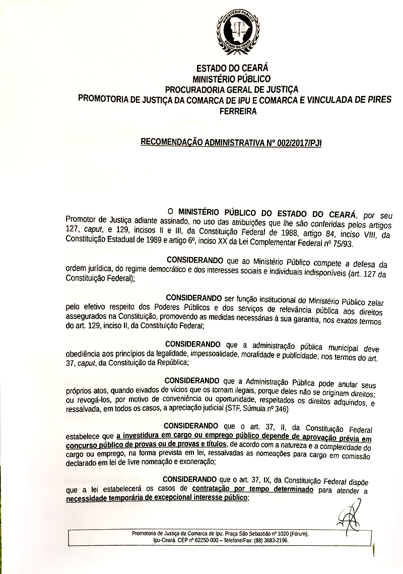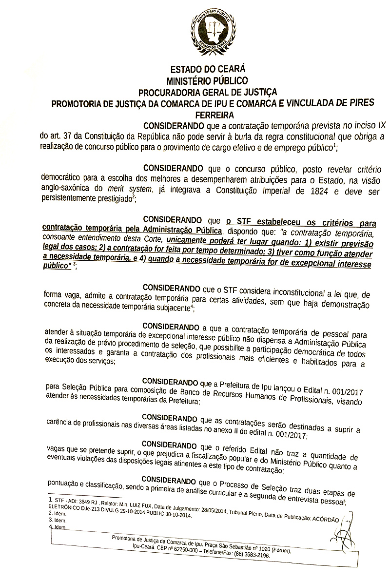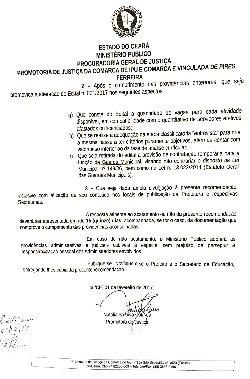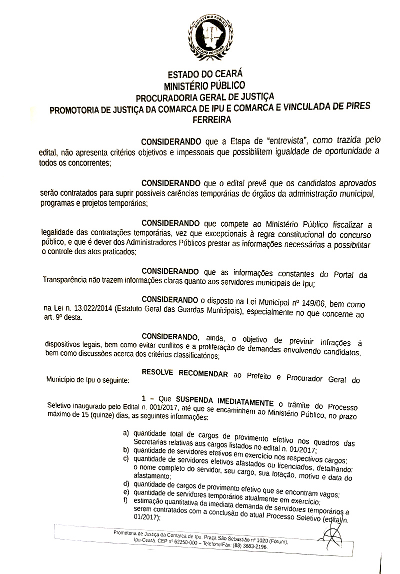 A promotora da Comarca de Ipu, Dra. Natália Saraiva Colares, expediu recomendação ao Prefeito Municipal e ao Procurador Geral do Município de Ipu (a 296 km de Fortaleza) para que promovam a suspensão imediata do Processo Seletivo Simplificado, relativo ao Edital 001/2017.Na recomendação administrativa, de número 002/207/PJI, a promotora de Justiça solicita da prefeitura no prazo de 15 (quinze) dias as seguintes informações: Quantidade total de cargos de provimento efetivo nos quadros das Secretarias relativas aos cargos listados no edital nº 01/2017; quantidade de servidores efetivos em exercício nos respectivos cargos; quantidade de servidores efetivos afastados ou licenciados, detalhando: o nome completo do servidor, seu cargo, sua lotação, motivo e data do afastamento; quantidade de cargos de provimento efetivo que se encontram vagos; quantidade de servidores temporários atualmente em exercício; estimação quantitativa da imediata demanda de servidores temporário a serem contratados com a conclusão do atual Processo Seletivo (edital nº 01/2017).