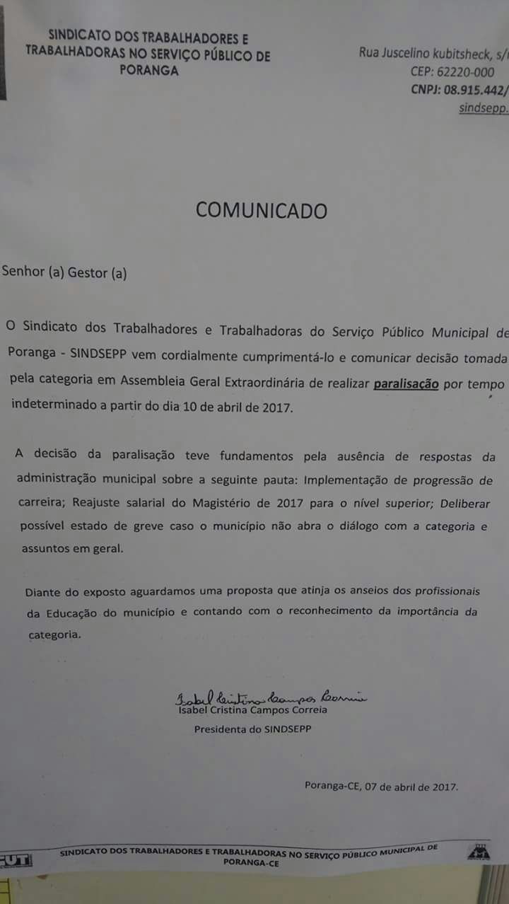 Atenção senhores pais de alunos e população em geral, o sindicato dos servidores públicos de Poranga e a classe de professores informa que a partir da próxima segunda feira dia 10/04/2017, todas as escolas da rede municipal de ensino estarão em greve por tempo indeterminado, até que se tenha um posicionamento favorável do prefeito municipal em relação ao percentual do reajuste salarial dos professores do referido município.