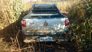 O veículo Fiat/Strada, ano 2015/2016, de cor prata, placa PPL 9095 – Irupi/ES, foi encontrado abandonado na noite deste domingo 09/07/2017, nas margens da CE 176 entre a Localidade de Cruzeta e a cidade de Catunda.