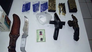 Duarte patrulhando pelo Bairro Piracicaba- Santa Quitéria, avistaram dois indivíduos em atitude suspeita em um Táxi e na Rua Djalma Catunda, próximo ao número 442 Bairro Piracicaba, Santa Quitéria, onde os PMs abordaram o Táxi de Placa OCM1271 Chevrolet/Classic LSde Cor Branca que vinha os dois indivíduos e em poder dos mesmo foi encontrado 01 pistola Calibre 9MM , numeração ilegível, 01 revolver calibre 38 numeração ilegível, 92 unidades de munição de 9MM, 31 umidades de munição de revolver cal. 38 e 61g de Cocaína, 01