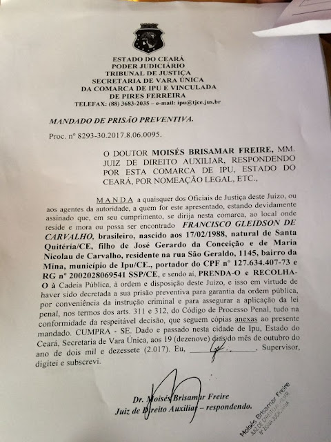 Policiais militares de Ipueiras , soldados Chagas e Oliveira, prenderam na manhã desta terça feira 24/10/2017, no local denominado de Caldeirão no Distrito de Charito – Ipueiras, o indivíduo:. Francisco Gledson de Carvalho, vulgo Bebelô, nascido aos 17/02/1988, natural de Santa Quitéria, residente na Rua São Geraldo, Bairro da Mina em Ipu.Bebelô foi preso através de um mandado de prisão preventiva expedido pelo Dr Moisés Brisamar Freire, juiz de direito da comarca de Ipu.