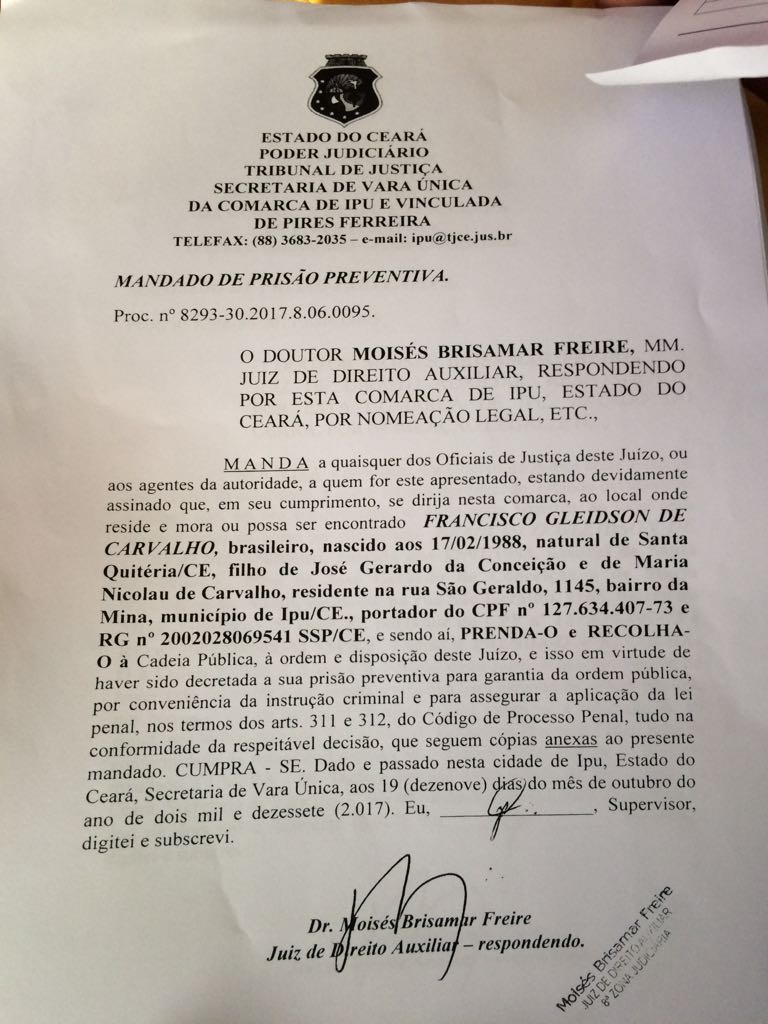 Policiais militares de Ipueiras , soldados Chagas e Oliveira, prenderam na manhã desta terça feira 24/10/2017, no local denominado de Caldeirão no Distrito de Charito – Ipueiras, o indivíduo:. Francisco Gledson de Carvalho, vulgo Bebelô, nascido aos 17/02/1988, natural de Santa Quitéria, residente na Rua São Geraldo, Bairro da Mina em Ipu.Bebelô foi preso através de um mandado de prisão preventiva expedido pelo Dr Moisés Brisamar Freire, juiz de direito da comarca de Ipu.