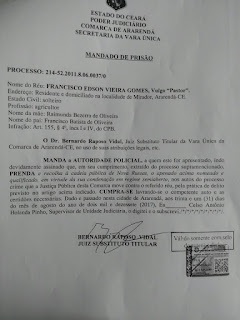 Pastor foi preso através de um mandado de prisão expedido pelo Juíz Dr Bernardo Raposo Vidal, da comarca de Ararendá.