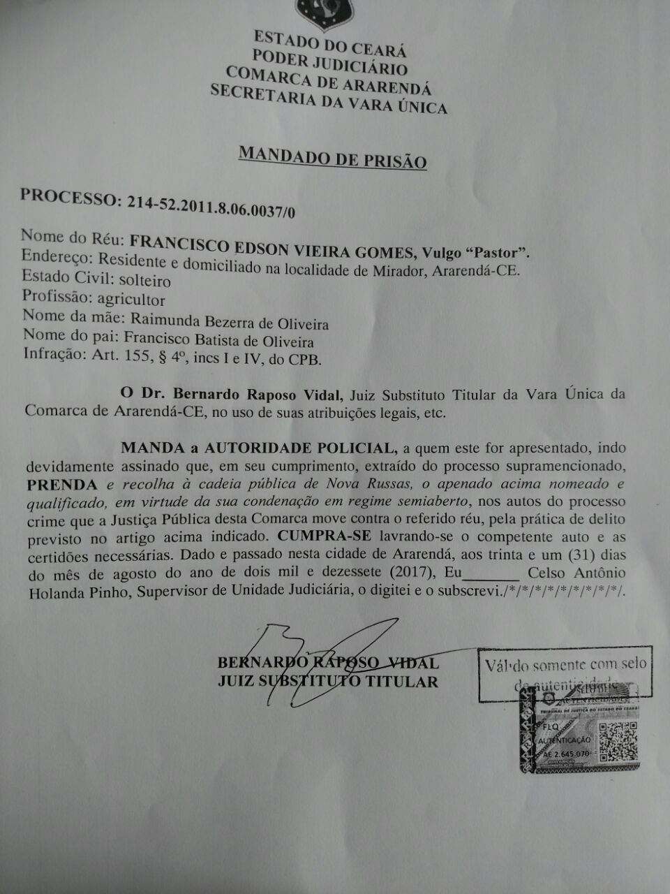 Pastor foi preso através de um mandado de prisão expedido pelo Juíz Dr Bernardo Raposo Vidal, da comarca de Ararendá.
