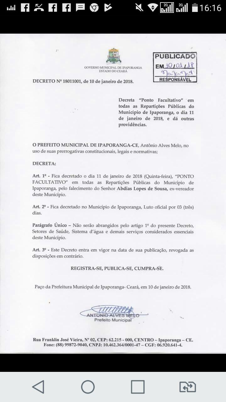 A prefeitura de Ipaporanga decretou ponto facultativo nesta quinta feira (11/01) nas repartições públicas do município, além de três dias de luto em virtude do falecimento do senhor Abdias Lopes.