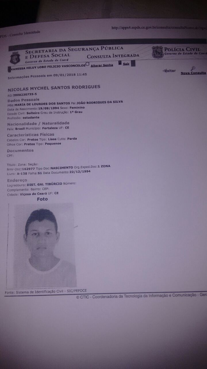 Policiais militares Sargento Carlos Soares e soldados F.Junior e Oliveira, juntamente com a polícia civil de Ipueiras, prenderam na manhã desta terça feira 09/01/2018, próximo ao Cristo na cidade de Ipueiras, o indivíduo:. Nicolas Mychel Santos Rodrigues, nascido aos 22/12/1994, solteiro, natural de Fortaleza.De acordo com informações, o acusado é de alta periculosidade e é foragido da justiça de Fortaleza, sendo que o mesmo estaria escondido na cidade de Ipueiras.