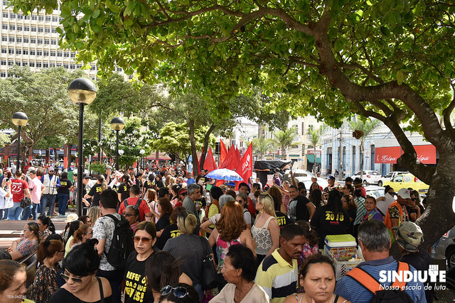 Manifestantes fizeram marcha da Praça do Ferreira ao Paço Municipal, nesta sexta (Foto: Reprodução/ Sindiute)
