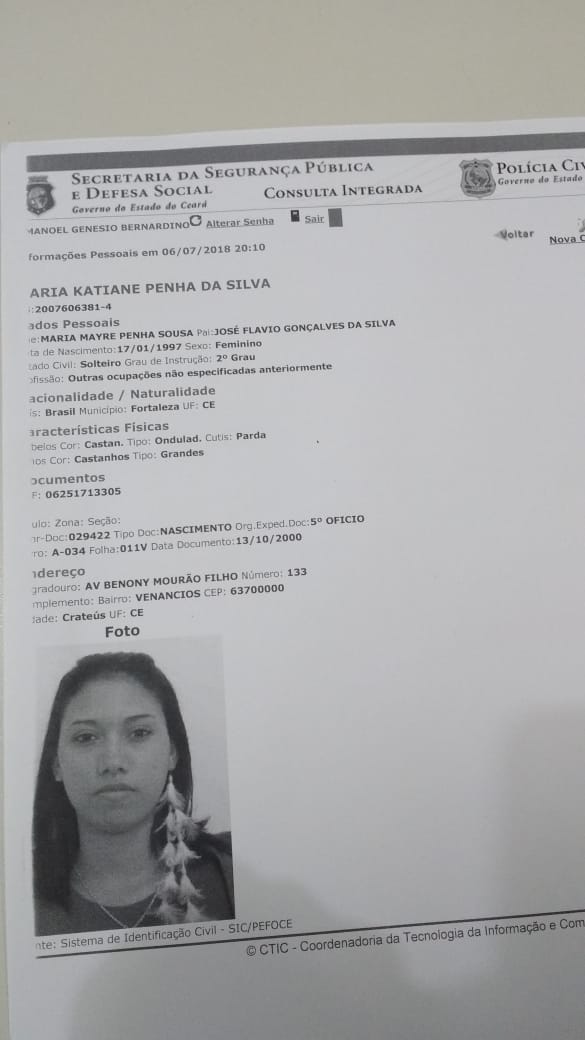 Acusada: Aria Katiane Penha da Silva , filha de Maria Mayre Penha Sousa e Jose Flávio Gonçalves da Silva , nascida aos 17/01/1997, residente na Avenida Benini Mourão Filho, Bairro dos Venâncios em Crateús.
