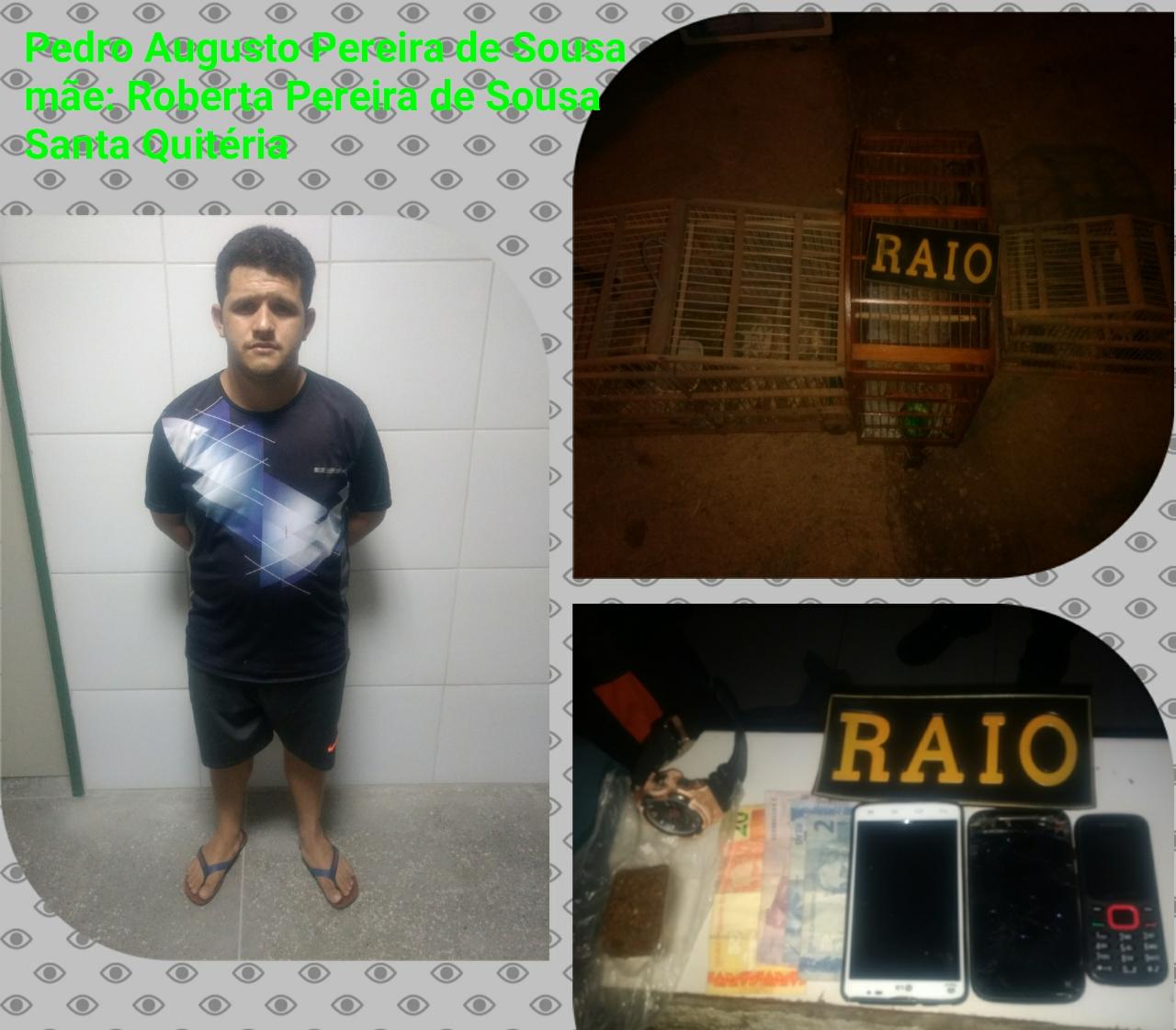 A Equipe RAIO 04 com apoio da equipe RAIO 03 em Patrulhamento na Rua Jerusalém Bairro Pedra da Saudade por volta das 23:20 do dia 12/07/18 recebeu uma informação através de populares de um elemento que estaria traficando drogas naquela área e assim foi repassado as características e foi feito a abordagem ao indivíduo de nome: Pedro Augusto Pereira de Sousa, nascido em 25/07/1993, residente no Bairro Pedra da Saudade- Santa Quitéria não sendo encontrado nada com ele porém diante das informações que a equipe já tinha foi perguntado onde era a residência dele e este apontou a casa, os policiais pediram para darem uma olhada na residência e assim o mesmo autorizou onde lá foi encontrado em cima de uma cômoda no quarto da residência:
