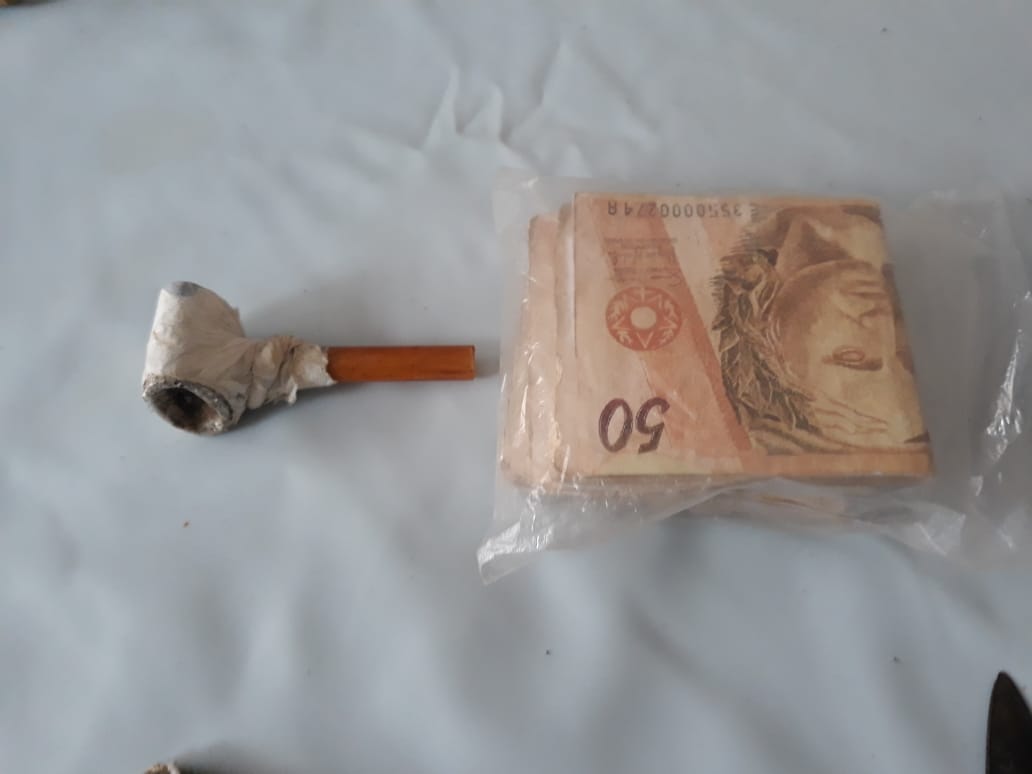 Nas estradas e bares da cidade os PMs apreenderam muitas armas brancas ( 26 facas), três simulacros de armas de fogo, um bolaço de dinheiro falso que seria empregado em um famoso golpe chamado de ( GOLPE DO BALUDO) e um cachimbo pra uso de crack.