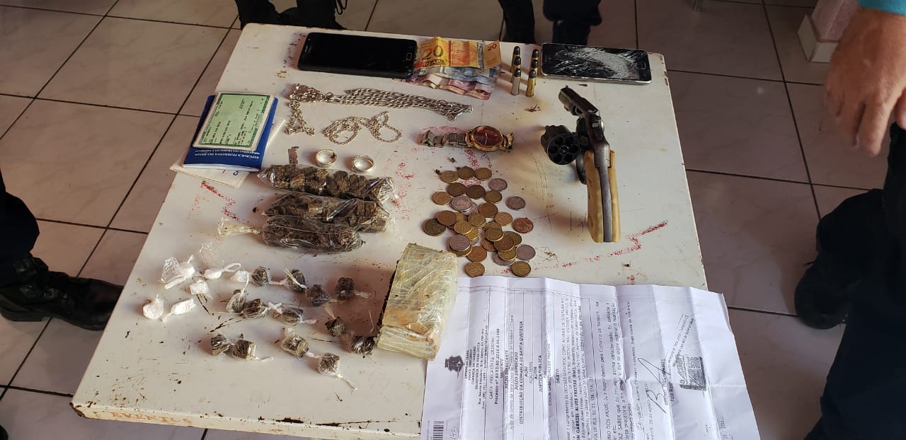 Em poder dos acusados a PM apreendeu dinheiro, drogas, um revólver e munições.