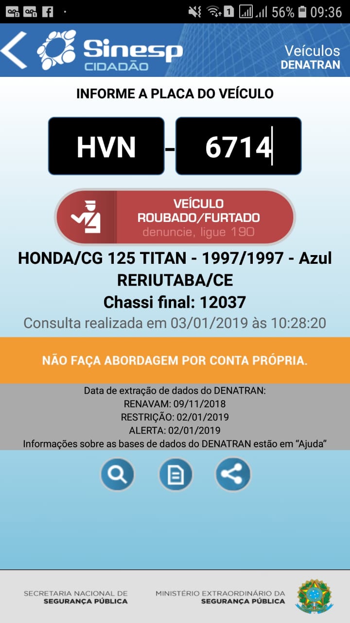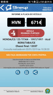 Nesta quarta feira 02 de janeiro de 2019, por volta das 10h00min, os PMs foram informados via 190 que estaria abandonada na localidade de Barro Vermelho a aproximadamente 13 quilômetros da cede, uma motocicleta HONDA CG 125 DE COR AZUL e placa HVN 6714 contra a mesma consta queixa de roubo.