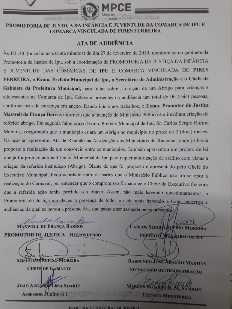 Após uma reunião entre o Ministério Público e o Prefeito de Ipu Sérgio Rufino, o município concordou em acatar os pedidos ministeriais. O fato fez com que o MP não ficasse contrário a realização do Ipu Folia 2019. Segue abaixo o documento da referida reunião: