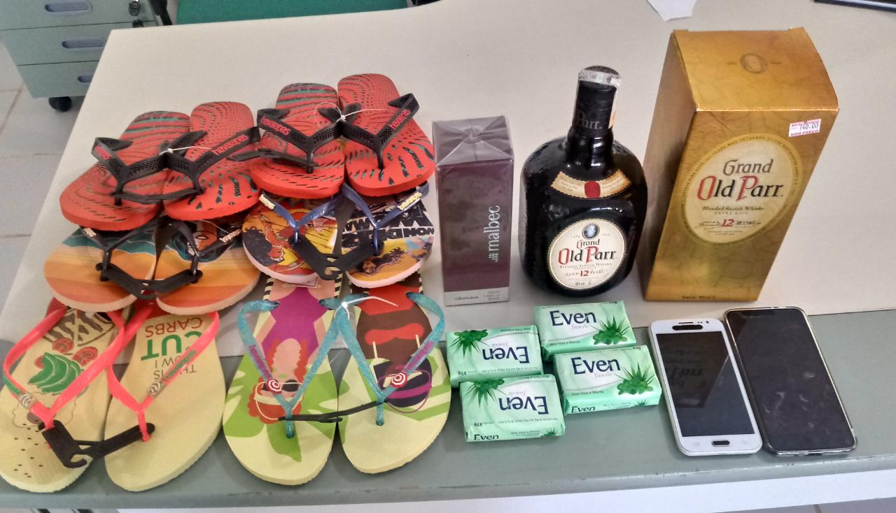 Ao fazer uma vistoria no veiculo foram encontrados varios produtos furtados, sendo: 06 pares de sandália Avaianas, 03 sabonetes, 01 desodorante Malbec, 01 litro de whisky old parr