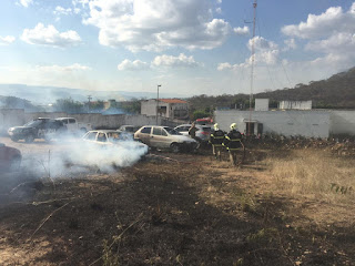O policiamento estava em uma ocorrência, na zona rural, quando chegaram à cidade, avistaram uma intensa fumaça preta; o policiamento, em diligências, verificou o fogo em um matagal seco, próximo a delegacia.