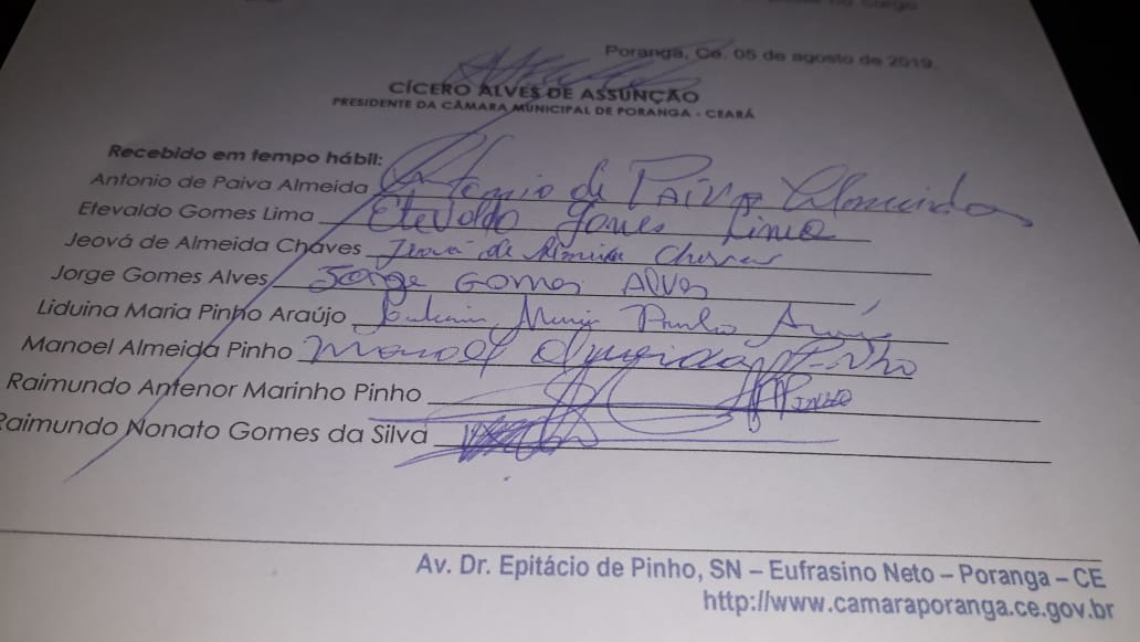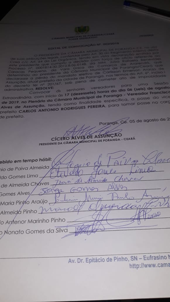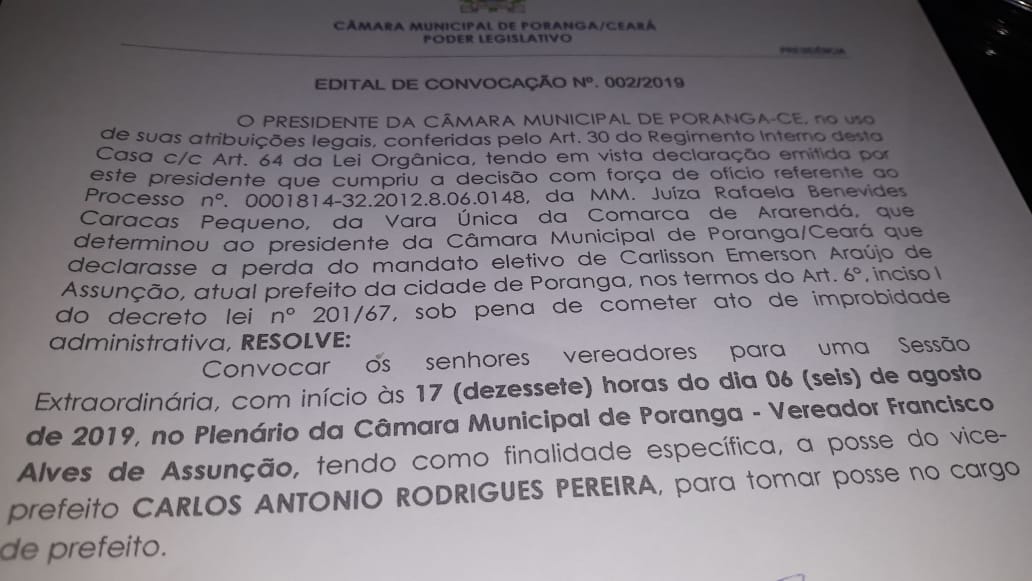 Poranga – CE, no uso de suas atribuições legais conferida pelo ART 30 do regimento interno desta casa C/C artigo 64 da lei orgânica, tendo em vista declaração emitida por este presidente que cumpriu a decisão com força de ofício referente ao processo ….. Da MM Juíza Rafaela Benevides Caracas Pequeno, da vara única da comarca de Ararendá que determinou ao presidente da Câmara municipal de Poranga/Ceará, que declarasse a perda do mandato eletivo de Carlison Assunção atual prefeito da cidade de Poranga nos termos do ART 6° inciso I do decreto lei 201/67, sob pena de cometer ato de improbidade administrativa, RESOLVE: Convocar os senhores vereadores para uma sessão extraordinária, com início às 17(dezessete) horas do dia 06(seis) de agosto de 2019, no plenário da Câmara municipal de Poranga – Vereador Francisco Alves de Assunção, tendo como finalidade específica, a posse do vice prefeito Carlos Antônio Rodrigues Pereira para tomar posse no cargo de prefeito.