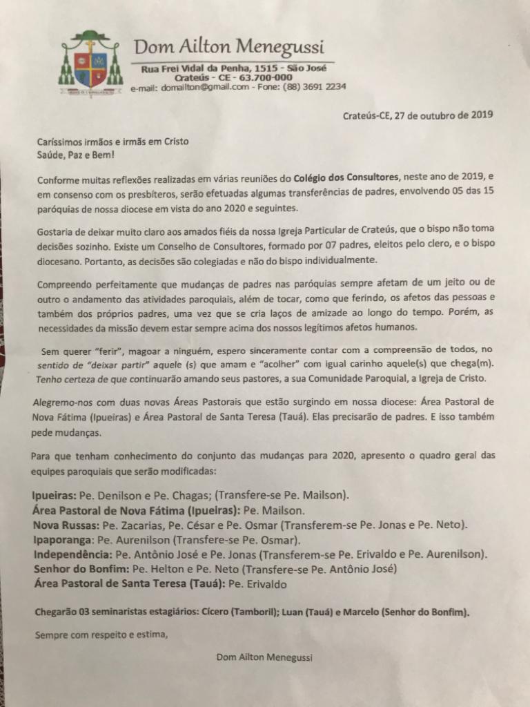 Em uma carta divulgada neste domingo, 27/10/2019, o Bispo Diocesano, Dom Ailton, confirmou  a transferência de Padres em 05 das 15 paróquias da Diocese de Crateús. Entre as mudanças está a confirmação  do Padre Erisvaldo, que atua em Independência, para assumir a área pastoral de Santa Teresa, no Município de Tauá. A paróquia de Tauá também passa a contar com a atuação de um seminarista, Luan.