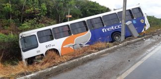 Ônibus derrapa, derruba fotossensor e cai em ribanceira no Ceará