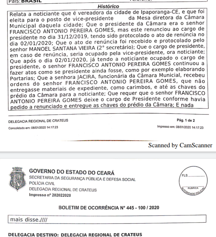 Diante grande polêmica envolvendo o Legislativo de Ipaporanga, a vereadora Elicia de Paula (PDT) e esposa do ex vereador Rogério de Paula, no último dia 08 de janeiro de 2020, compareceu a Delegacia de polícia civil em Crateús onde registrou um BO (boletim de ocorrência) onde a mesma afirma que o vereador Gomes renunciou ao cargo de presidente e que agora se recusa a entregar o cargo.