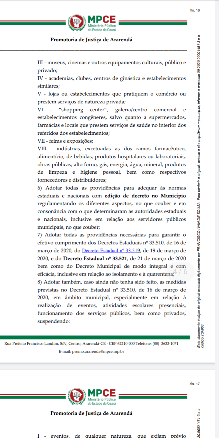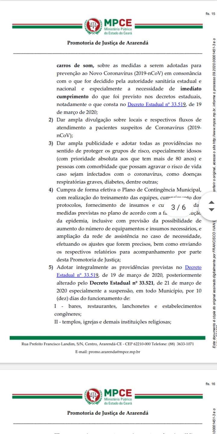 Estaduais nº 33.510, de 16 de março de 2020, do Decreto Estadual nº 33.519, de 19 de