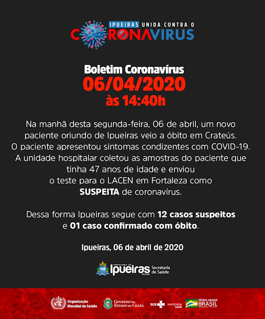 De acordo com o último boletim da secretaria de Saúde do Município,  na manhã desta segunda-feira (06), Ipueiras tem 12 casos suspeitos e um óbito confirmado do novo coronavírus.