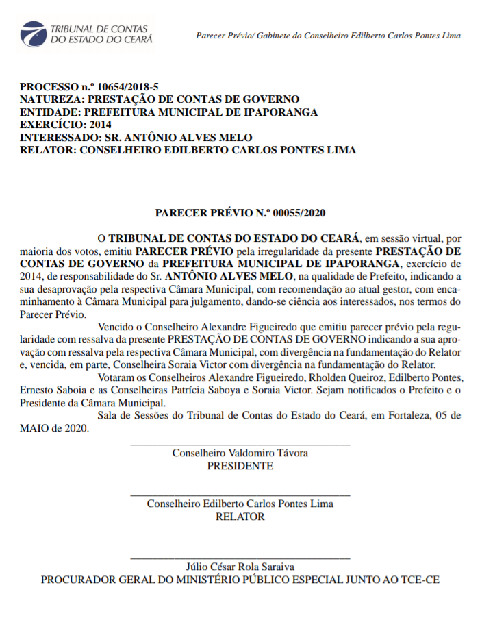 Para a grande surpresa do Prefeito, no último dia 05 de maio de 2020, o TCE/CE, votou as contas do político e emitiu parecer pela desaprovação das contas de governo de Toinho Contábil (exercício 2014).