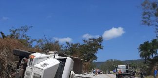 Caminhão carregado de postes tomba na rodovia CE 292.