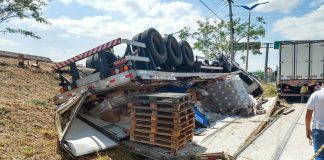 Carreta carregada com frios tomba em vala após desviar de carro...