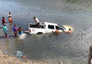 Após o acidente, moradores da região, com o auxílio de cordas e um trator, conseguiram desvirar o veículo, que foi retirado da água em uma rampa improvisada com madeiras. O teto e as portas da caminhonete ficaram amassados.