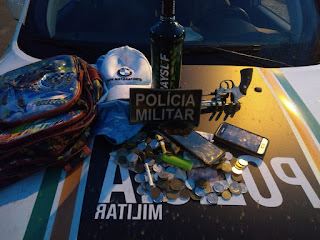 Em poder de Preguinho, os policiais militares apreenderam uma muchila contendo o dinheiro (150 reais) que havia sido tomado de assalto no Canindezinho, bem como 2 aparelhos celulares, 01 revólver calibre 32, 4 munições, 01 garrafa de vodka, além da Motocicleta Bros vermelha, que a dupla usou Durante o assalto contra a vítima no Distrito de Canindezinho.