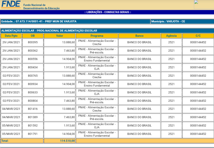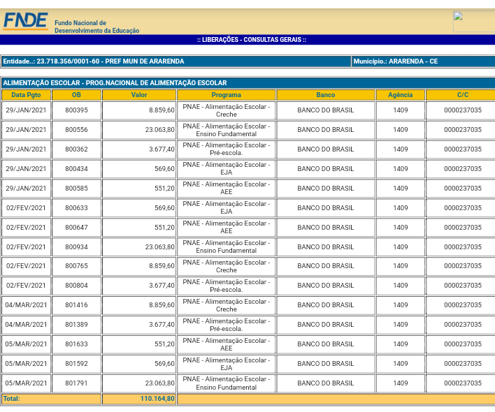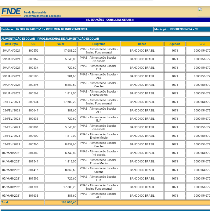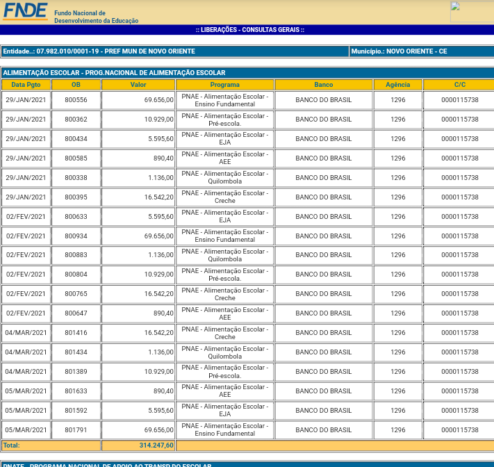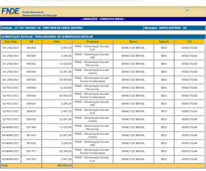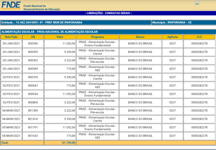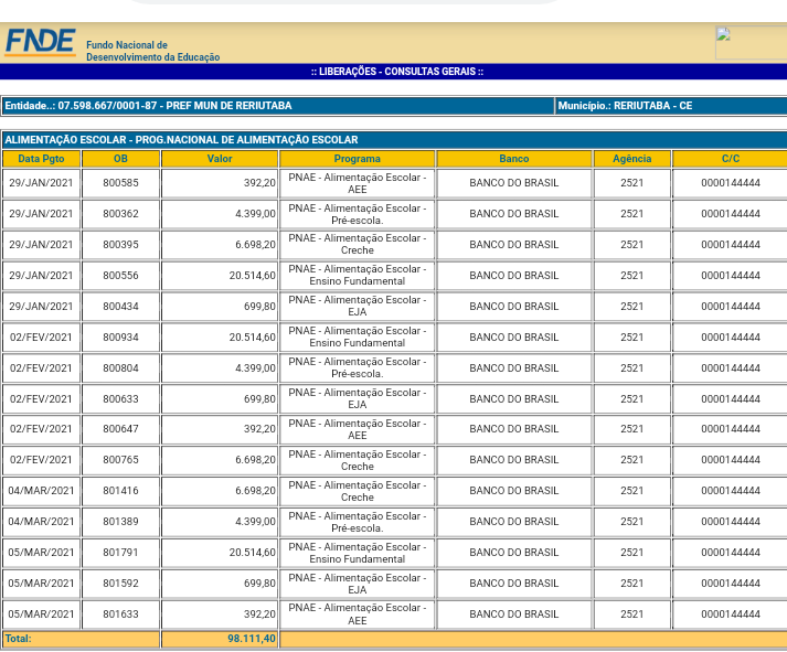 Baseado em dados do FNDE (Fundo Nacional de Desenvolvimento da Educação), informações mostram quanto cada município da região recebeu no primeiro trimestre (janeiro/fevereiro/e março) de 2021, relacionado ao programa nacional de alimentação escolar, o qual é destinado para a compra da merenda escolar.