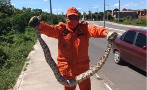 Uma serpente da espécie jiboia, de dois metros de comprimento, foi regatada pelo Corpo de Bombeiros no Sítio Arraial de Cima, zona rural do município de Missão velha, no interior do Ceará, na manhã deste domingo (23).