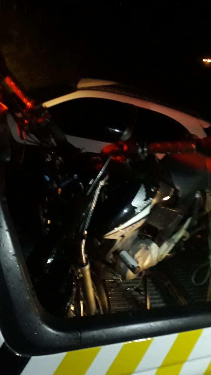 Com essas informações a composição se deslocou até o local onde foi constatada a veracidade dos fatos. Foi verificado que os veículos envolvidos se tratavam da motocicleta HONDA/CG 150 TITAN ESD, de COR PRETA, e um carro GM/CELTA, de COR BRANCO.