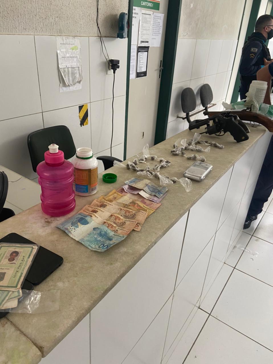 A droga foi encontrada nos Matos dentro de frascos (46 balinhas de maconha ) E duas armas (revólveres calibre 38, numeração suprimida, e uma garrucha), sendo que um pouco mais a frente, dentro de sacos plásticos.