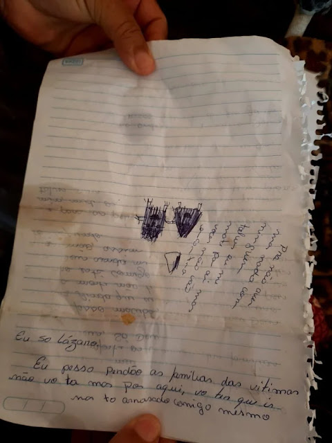 A redação contém inicialmente um pedido de desculpas aos parentes que sofreram com as ações dele. “Eu pesso (sic) perdão às famílias das vítimas”, teria escrito.