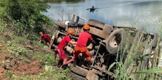 Auxiliar preso em ferragens é resgatado após caminhão tombar em açude...