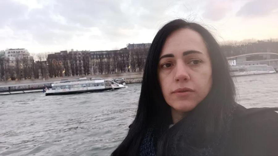 Fernanda é uma mulher branca, de cabelos pretos, lisos. Na foto, ela está em Paris.
