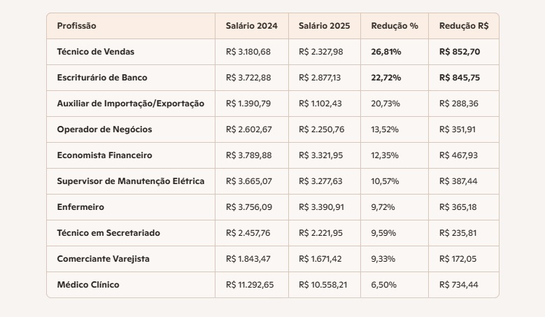 O maior impacto foi para técnicos de vendas, que tiveram redução de R$ 852, passando de R$ 3.180,68 em 2024 para R$ 2.327,98 em 2025. Os escriturários de banco também sofreram forte queda, com R$ 845 a menos, indo de R$ 3.722,88 para R$ 2.877,13. Profissões como auxiliar de importação/exportação, operador de negócios, economista financeiro, supervisor de manutenção elétrica, enfermeiro, técnico em secretariado, comerciante varejista e até médico clínico também tiveram reduções expressivas.